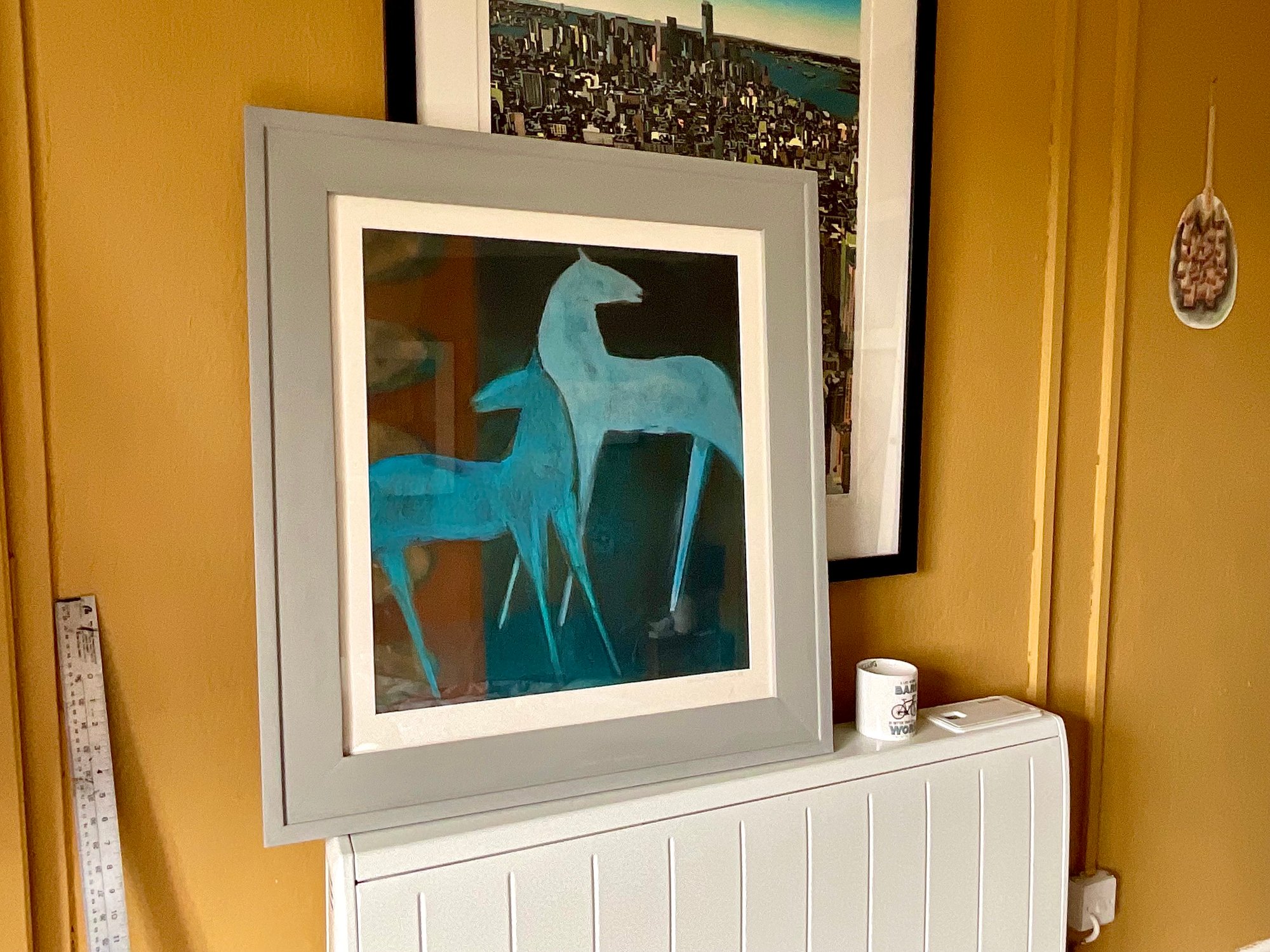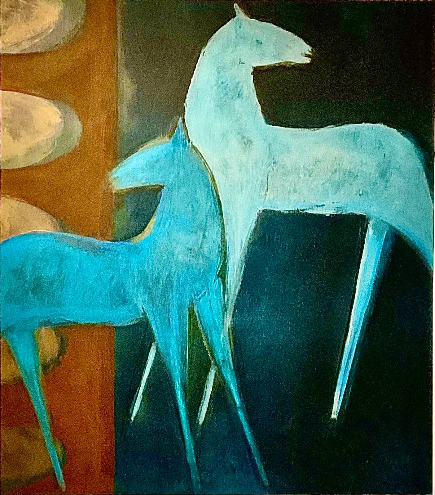 The two horses are looking backwards and standing proud, they are painted in different blues with a brown bridge design on the left side. The whole picture measures 63 cm wide x 88 cm tall . The work is signed and ready to hang.