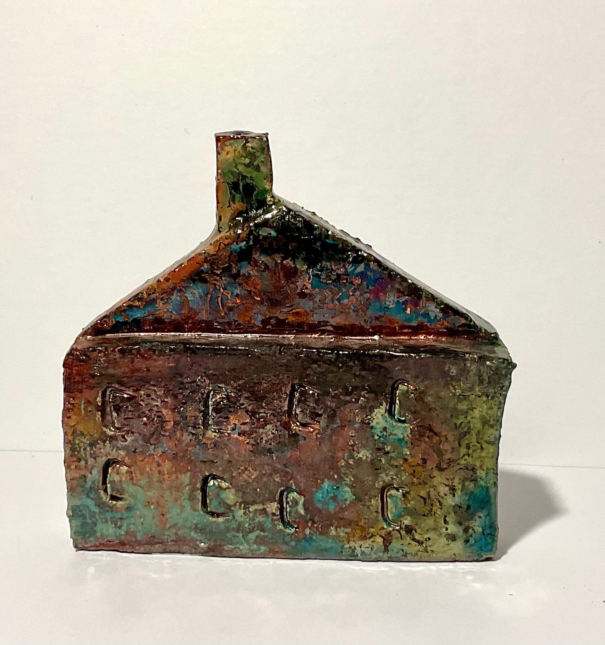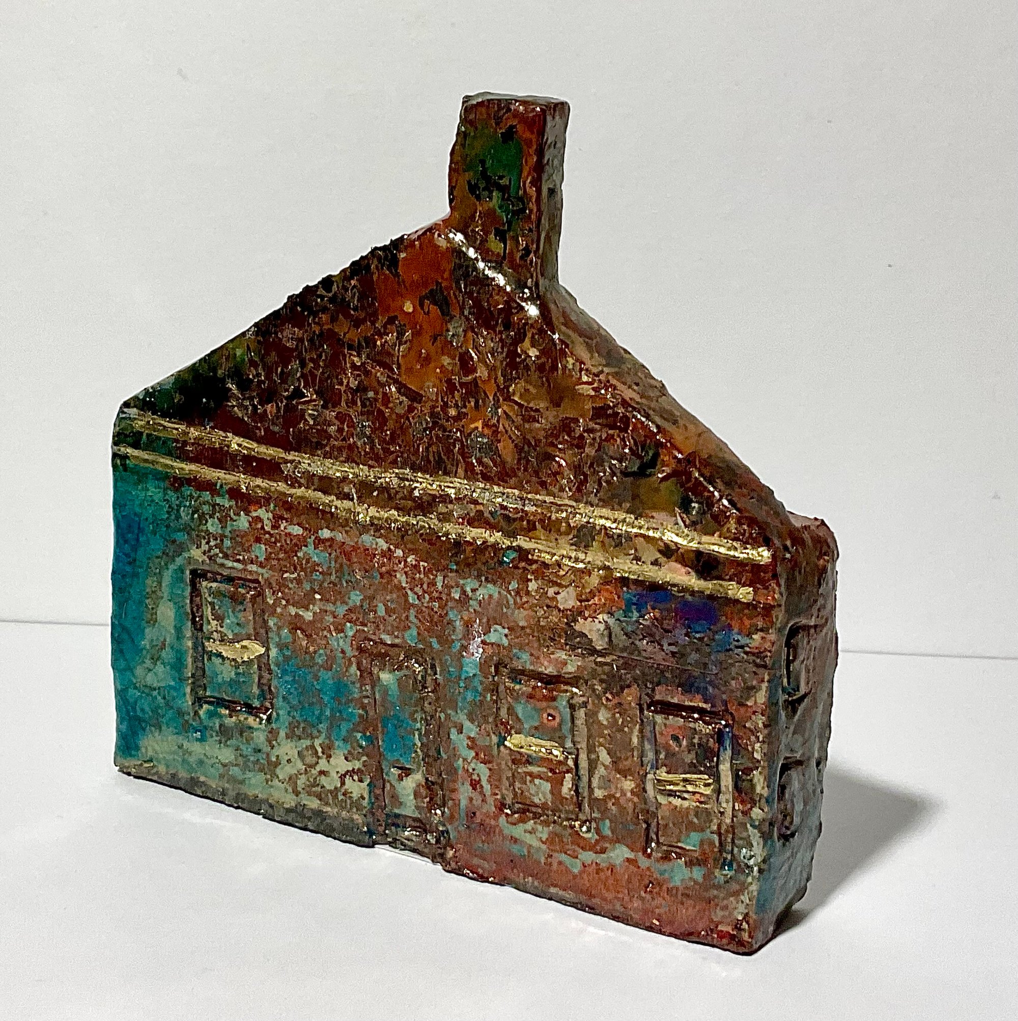 The Cottage has been glazed with specialist Raku glazes in copper and turquoise colours , and has been fired in an outside kiln.