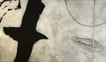 This method involves using a fine grit ( carborundum) which is mixed with glue and painted into a shape or design , in this case a bird design. The design is painted onto a metal substrate and then inked up and printed onto handmade paper.