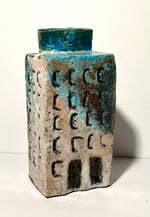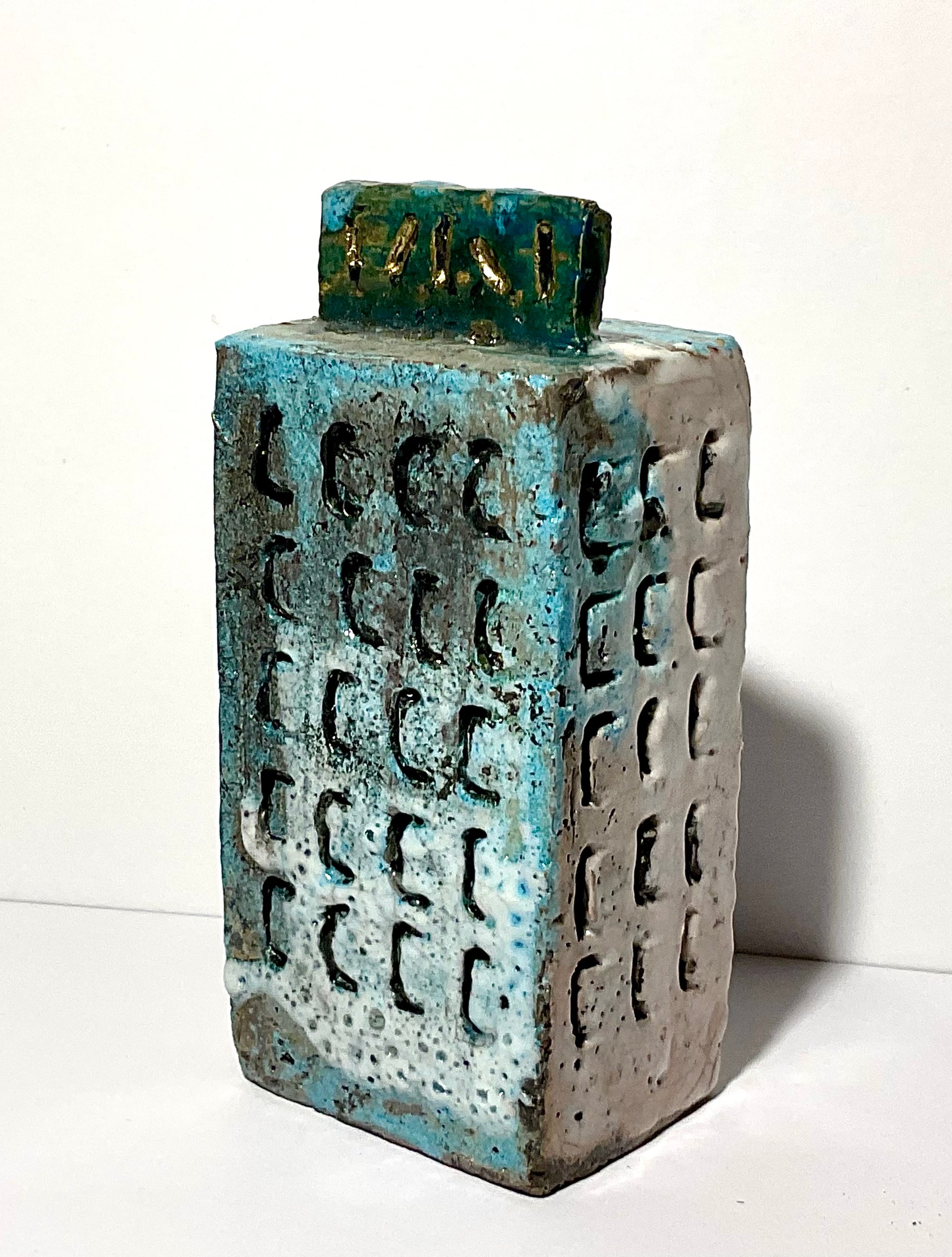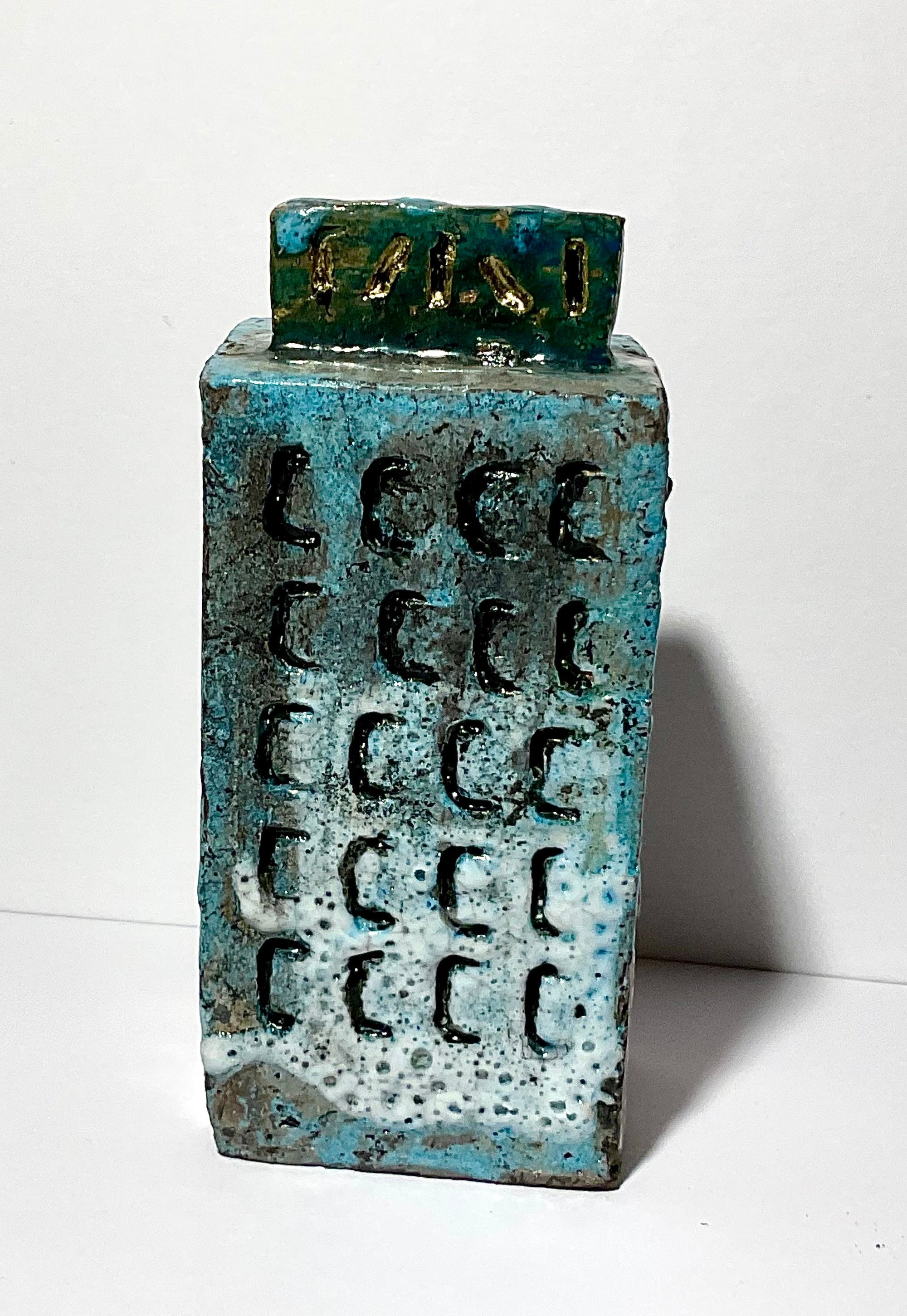 The building is part of a set of little ceramic buildings that are all different and all unique. They are glazed in turquoise and white crackle glazes and are labelled on the bottom. They are very miniature in size, this one measuring approximately 11 cm tall x 5 cm wide and deep.