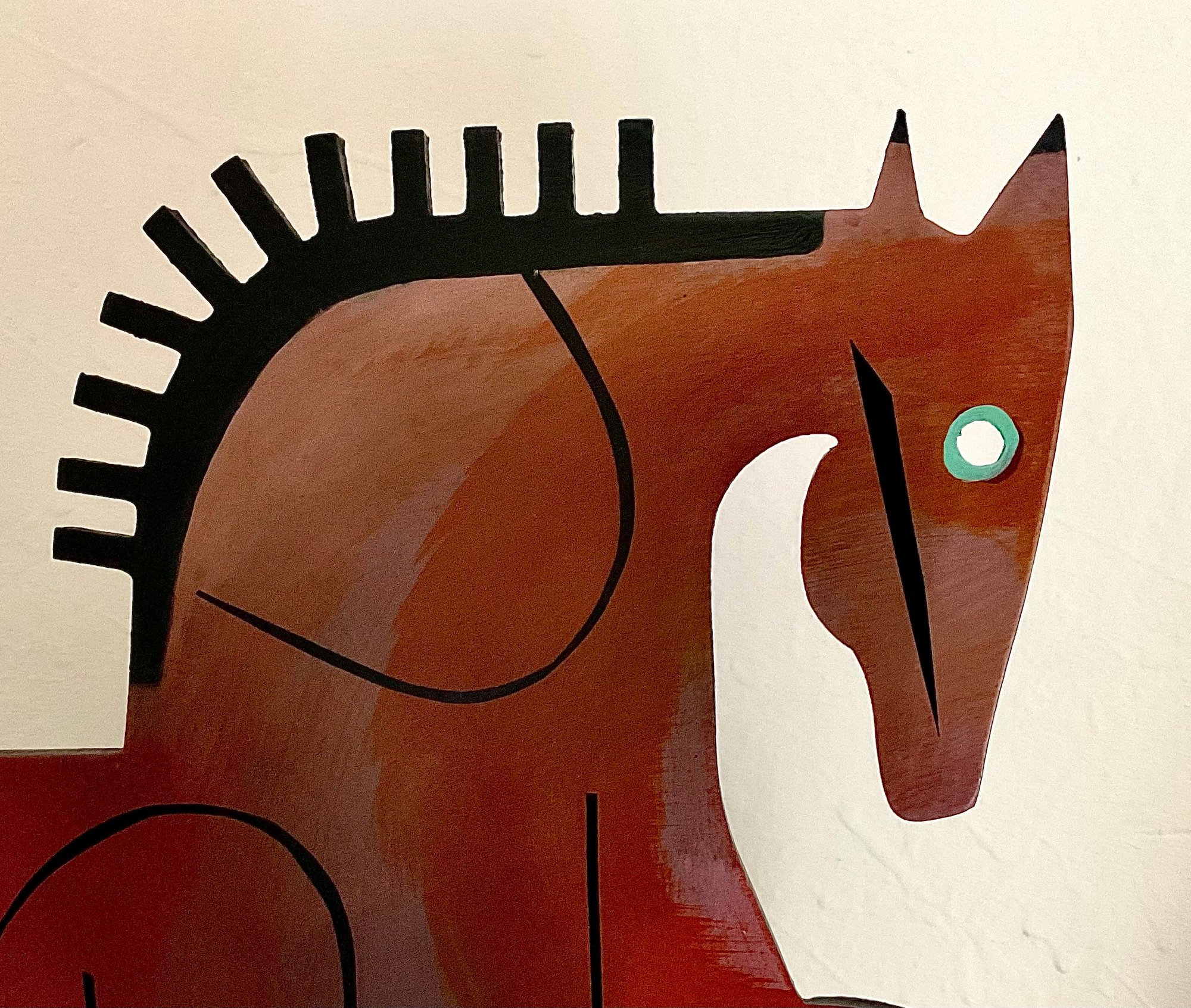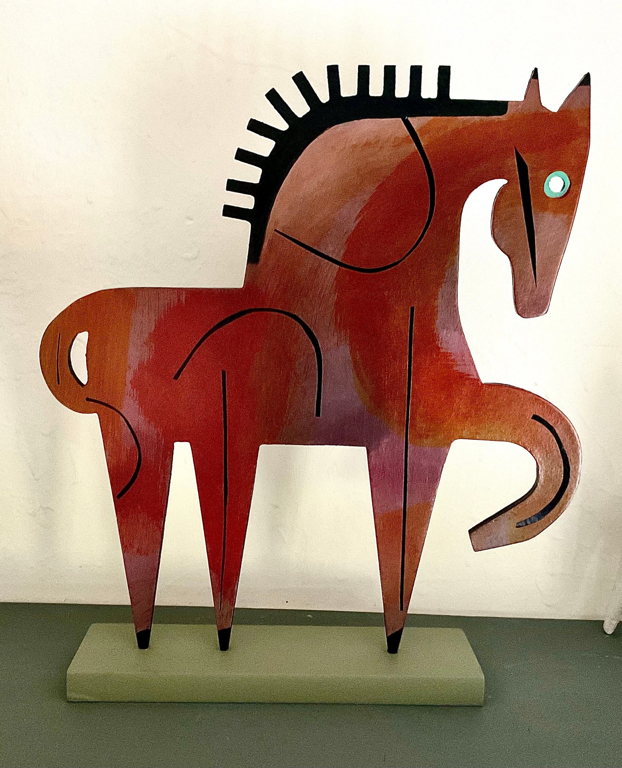 This Horse is painted purple colours on one side and deep oranges on the reverse. He measures 30 cm wide by 36 cm tall and stands on his own wooden base. Very light weight as he is made from 5 mm thick MDF . He is numbered and signed on the bottom of the base. A unique piece ! ( not a toy ) In the last picture he is the horse on the far left .
