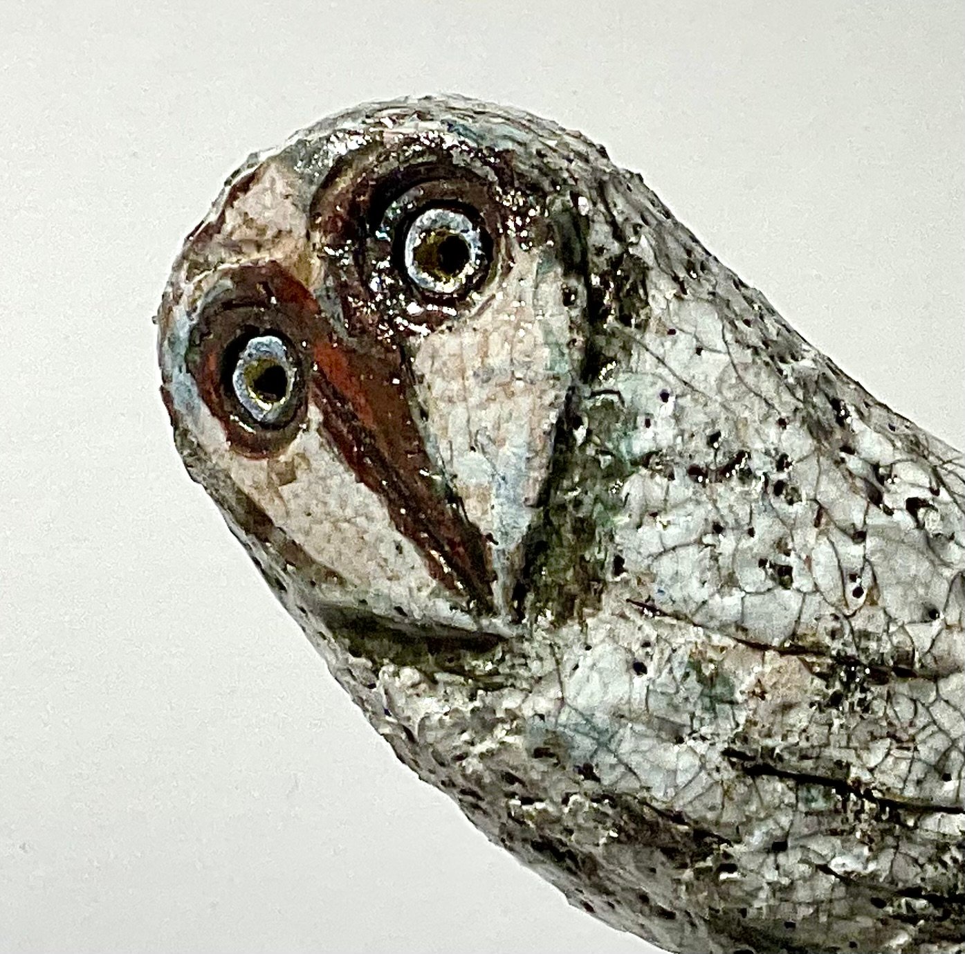 Small Raku fired ceramic owl on a wooden base.