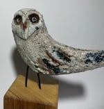 My new Owl sculptures are a series of 12, all slightly different in their appearance and stance. This one is number 4, he stands on a hardwood base which has been sanded and polished. He measures 21 cm tall x 12 cm at his widest.